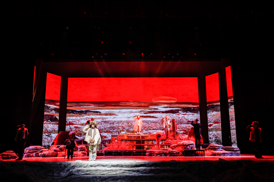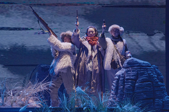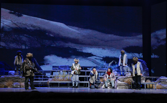 19時(shí)許,演出在風(fēng)雪彌漫的舞臺(tái)背景中拉開(kāi)帷幕。話(huà)劇《風(fēng)雪漫過(guò)那座山》以20世紀(jì)40年代初東北抗聯(lián)戰(zhàn)斗為背景,講述了政委方梅帶領(lǐng)六名戰(zhàn)士在“神山”突圍時(shí)的生死抉擇。全劇采用復(fù)合敘事結(jié)構(gòu),將現(xiàn)實(shí)場(chǎng)景與心理片段交織,設(shè)置“記憶閃回”以強(qiáng)化人物心理,舞臺(tái)設(shè)計(jì)用意象化的手法替代寫(xiě)實(shí)的戰(zhàn)斗場(chǎng)面。演出中,演員們以扎實(shí)的表演功底全身心投入,以鏗鏘有力的舞臺(tái)語(yǔ)言與張弛有度的肢體動(dòng)作,精準(zhǔn)表現(xiàn)了不同角色在面對(duì)生死之時(shí)的絕望、希望與堅(jiān)毅,讓每一位抗聯(lián)戰(zhàn)士形象立體鮮活,使觀(guān)眾穿越時(shí)空,真實(shí)感受到抗聯(lián)戰(zhàn)士所面臨的艱苦卓絕的戰(zhàn)爭(zhēng)場(chǎng)景。當(dāng)劇情展現(xiàn)至戰(zhàn)士們互相攙扶、高喊革命口號(hào)的高潮段落時(shí),現(xiàn)場(chǎng)響起了熱烈的掌聲。