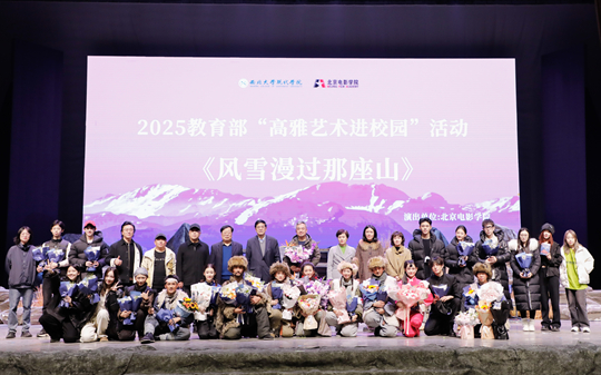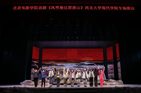 11月6日,教育部“高雅藝術(shù)進(jìn)校園”2025年系列活動(dòng)走進(jìn)西北大學(xué)現(xiàn)代學(xué)院,在學(xué)校文體館展演了由北京電影學(xué)院精心排練的大型紅色話(huà)劇《風(fēng)雪漫過(guò)那座山》。西北大學(xué)現(xiàn)代學(xué)院董事長(zhǎng)劉家全等學(xué)校領(lǐng)導(dǎo),著名演員趙思源、梁麗等嘉賓及陜西師范大學(xué)、長(zhǎng)安大學(xué)、西北大學(xué)、西安外國(guó)語(yǔ)大學(xué)、西安翻譯學(xué)院、西安外事學(xué)院等校師生代表上千人觀(guān)看了演出。