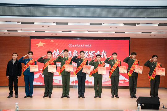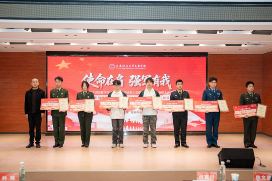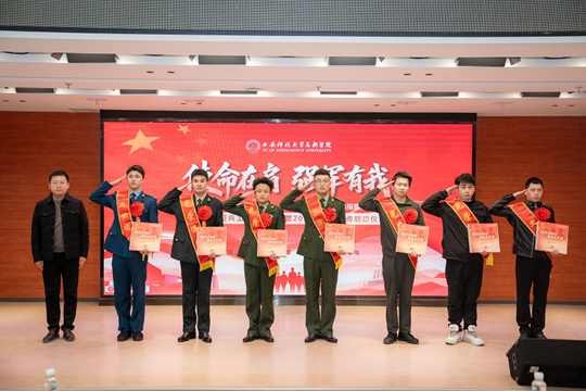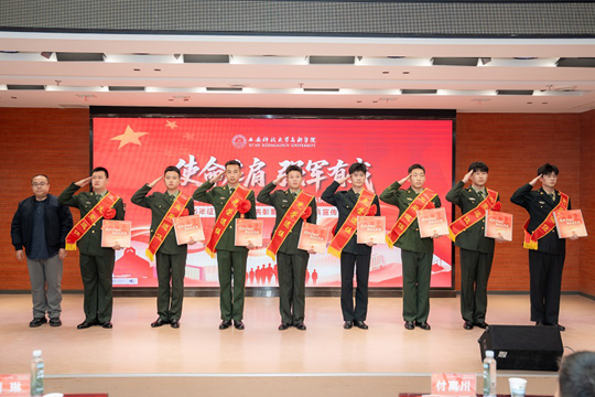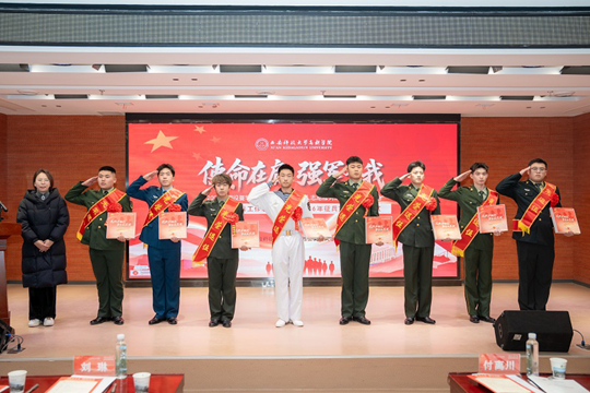 12月10日,西安科技大學(xué)高新學(xué)院2025年退役復(fù)學(xué)學(xué)生歡迎會(huì)、退役軍人志愿服務(wù)隊(duì)換屆暨表彰大會(huì)、2025年征兵工作總結(jié)表彰暨2026年征兵宣傳啟動(dòng)儀式,在學(xué)院圖書(shū)館報(bào)告廳隆重舉行。