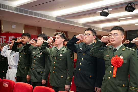 張子涵代表新一屆退役軍人志愿服務(wù)隊(duì)發(fā)言,他感謝領(lǐng)導(dǎo)、老師和同學(xué)們的信任與支持,表示將傳承“退伍不褪色,奉獻(xiàn)新時(shí)代”的精神與全體隊(duì)員一道傳承軍人本色,聚焦服務(wù)實(shí)效,凝聚團(tuán)隊(duì)力量,擦亮團(tuán)隊(duì)品牌,以忠誠(chéng)堅(jiān)守與熱忱擔(dān)當(dāng),為學(xué)院和社會(huì)貢獻(xiàn)青春力量,不負(fù)重托帶領(lǐng)退役軍人服務(wù)隊(duì)邁上新臺(tái)階。發(fā)言最后,他帶領(lǐng)全體退役軍人重溫入伍誓詞,“若有戰(zhàn),召必回”的鏗鏘誓言響徹會(huì)場(chǎng)。