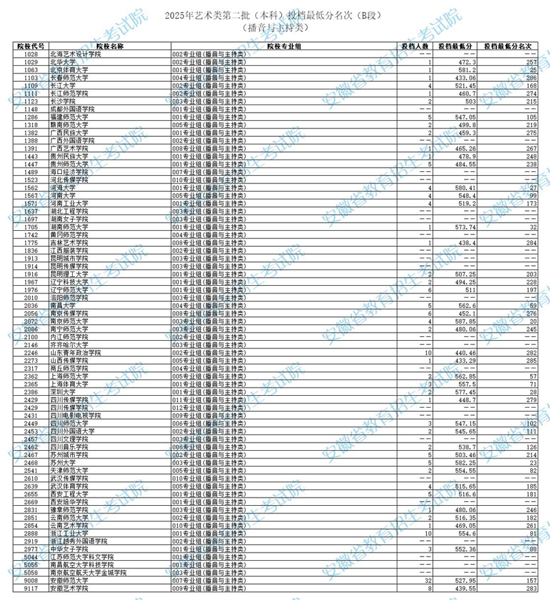 | 安徽:2025年藝術(shù)類第二批(本科)投檔最低分名次(B段)(播音與主持類) |