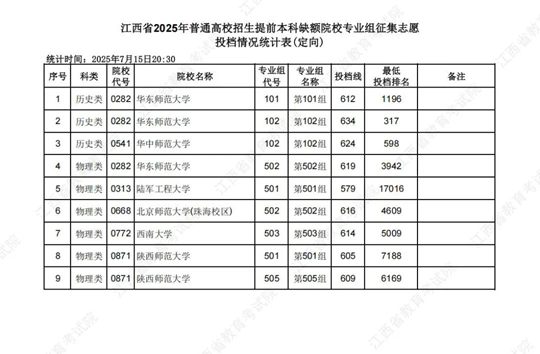 | 江西省2025年普通高校招生提前本科缺額院校專業(yè)組征集志愿投檔情況統(tǒng)計(jì)表(定向) |