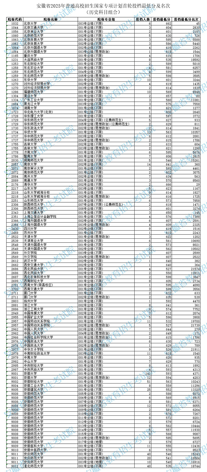 安徽省2025年普通高校招生國家專項計劃首輪投檔最低分及名次(歷史科目組合)