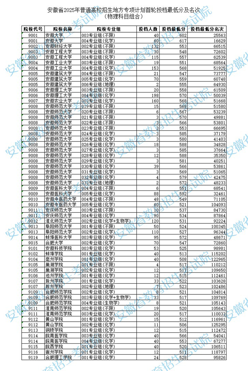 安徽省2025年普通高校招生地方專項計劃首輪投檔最低分及名次(物理科目組合)