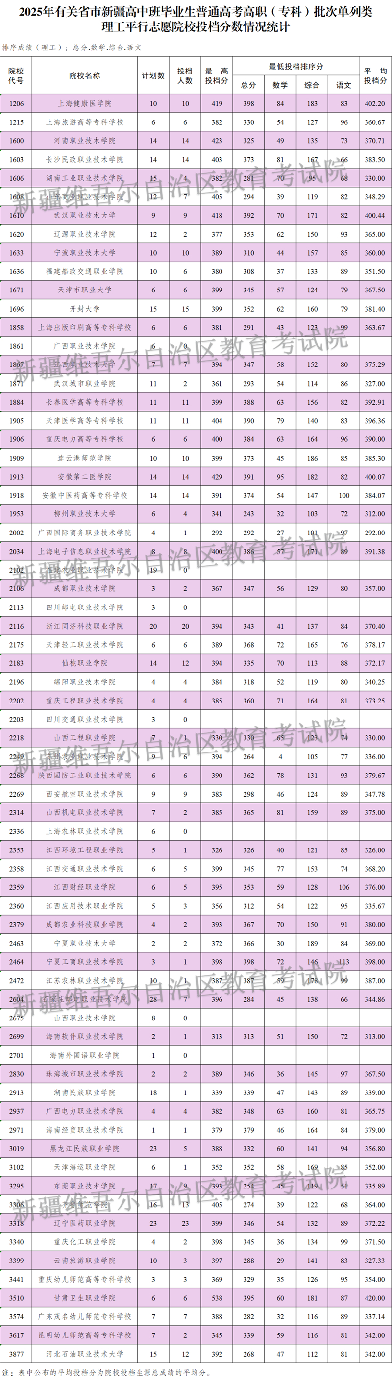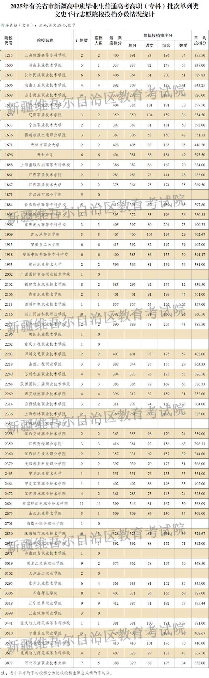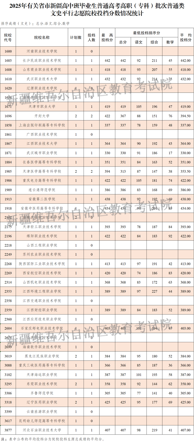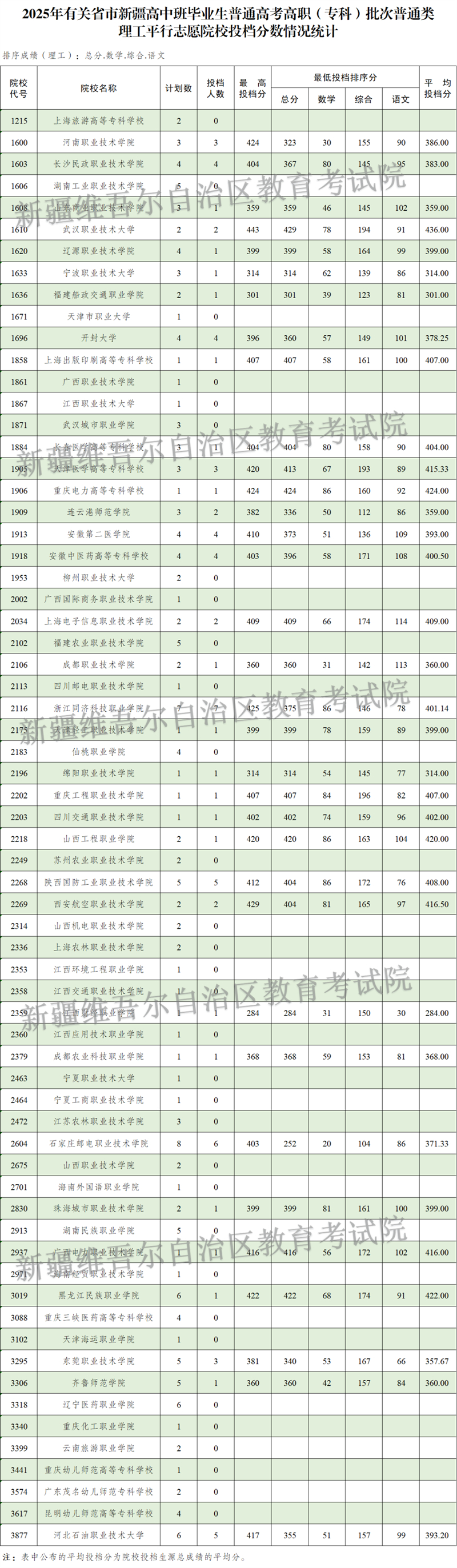 按照錄取工作安排,自治區(qū)2025年普通高校招收有關(guān)省市新疆高中班畢業(yè)生高職(?疲┡斡8月14日正式投檔錄取,新疆教育考試院根據(jù)投檔原則進行了投檔,現(xiàn)將相關(guān)院校投檔情況公布如下:
