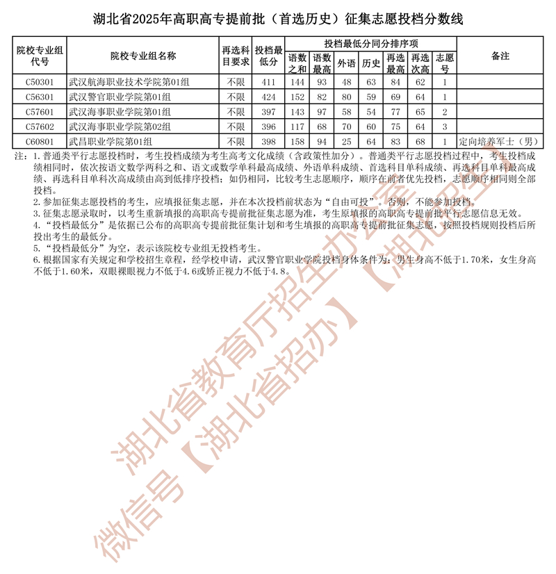 湖北省2025年高職高專提前批(首選歷史)征集志愿投檔分數(shù)線