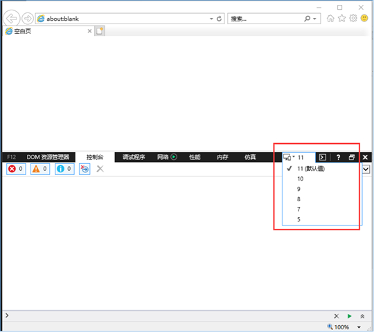 打開IE瀏覽器,點(diǎn)擊“F12”鍵,會(huì)出現(xiàn)瀏覽器模式設(shè)置,要求此處設(shè)置的版本必須與瀏覽器實(shí)際版本一致。