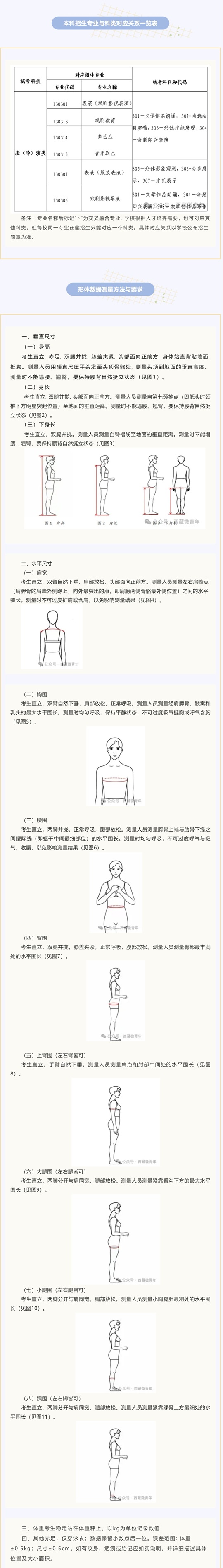 1.形體形象觀測考試目的:主要考查考生形體比例、肢體的勻稱性、協(xié)調(diào)性及膚質(zhì)等方面狀況,評價考生專業(yè)外部條件及形象氣質(zhì)等?荚囆问脚c要求:考生先完成形體測量(測量方法與要求見附件),然后5——10人一組進行正面、側(cè)面、背面體態(tài)展示。要求赤足、著泳裝,其中女生著純色、分體、不帶裙邊泳裝,男生著純色泳褲。