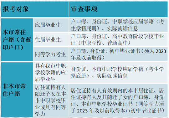 (2)具有本市常住戶籍的普通中專、職業(yè)高中、技工學(xué)校(以下簡稱“中職學(xué)!保┊厴I(yè)生、普通高中往屆畢業(yè)生、同等學(xué)力考生;具有本市中職學(xué)校正式學(xué)籍的應(yīng)屆畢業(yè)生;在本市中職學(xué)校畢業(yè)或具有同等學(xué)力的本市居住證持有人隨遷子女。