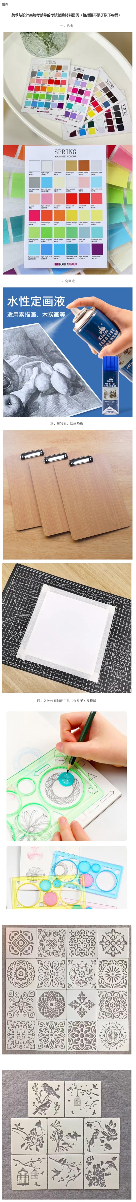 美術(shù)與設(shè)計類考生不得攜帶色卡、定畫液、速寫板(速寫墊)、各種繪畫輔助工具(含尺子)及模板等可能影響考試公平的考試輔助材料。(相關(guān)圖例見附件)