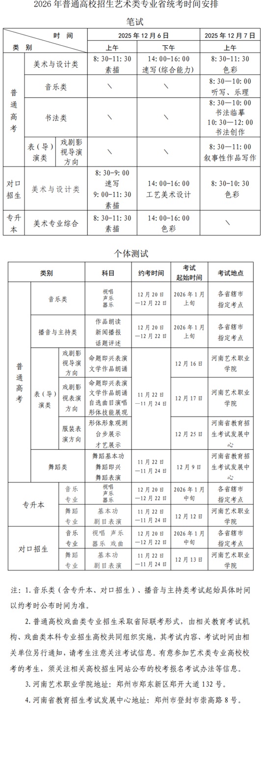 | 河南:2026 年普通高校招生藝術(shù)類(lèi)專(zhuān)業(yè)省統(tǒng)考時(shí)間安排 |