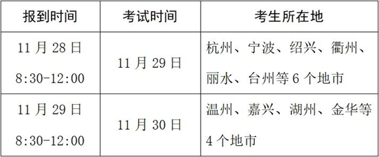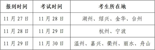 本次考試時間為11月28日—30日,按地區(qū)分三批在金華職業(yè)技術(shù)大學(xué)進(jìn)行。考生須于考試前一天,持本人身份證到組考學(xué)校辦理報到手續(xù),填寫考點(diǎn)規(guī)定的表格,領(lǐng)取準(zhǔn)考證,了解考試安排情況。報到地點(diǎn)見金華職業(yè)技術(shù)大學(xué)招生網(wǎng)(https://zsw.jhc.edu.cn)通知。具體時間安排如下: