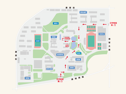 考生須從東門或南門進(jìn)入,地址南京市江寧區(qū)佛城西路8號(hào)(河海大學(xué)江寧校區(qū))。