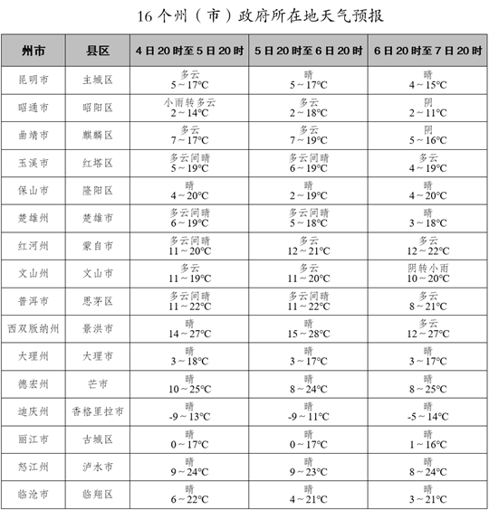 預計12月4日20時至7日20時,昭通市、曲靖市東部、文山州東部、紅河州南部、普洱市東南部多云間陰有小雨,其他大部分地區(qū)晴間多云。