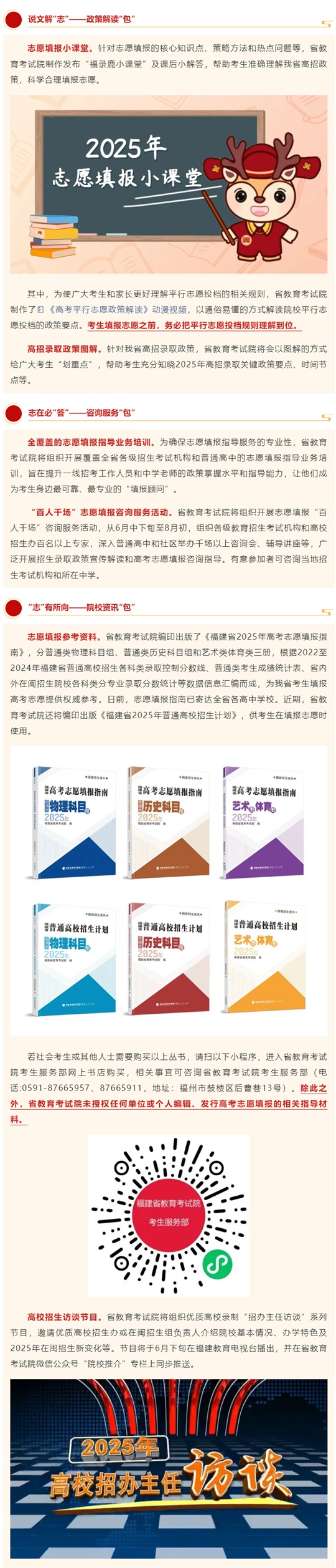 為助力廣大考生圓夢(mèng)理想學(xué)府,福建省教育考試院推出志愿填報(bào)服務(wù)“大禮包”,從政策解讀到填報(bào)技巧,從數(shù)據(jù)查詢到注意事項(xiàng),多渠道、多方式為大家提供志愿填報(bào)指導(dǎo)服務(wù),敬請(qǐng)考生和家長(zhǎng)密切關(guān)注!