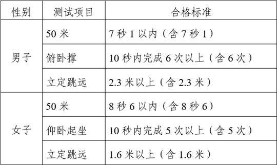 以上3個(gè)項(xiàng)目須全部進(jìn)行測(cè)評(píng)。其中,有2個(gè)及以上合格的,體能測(cè)試結(jié)論為合格。體能測(cè)試實(shí)行全程錄像。