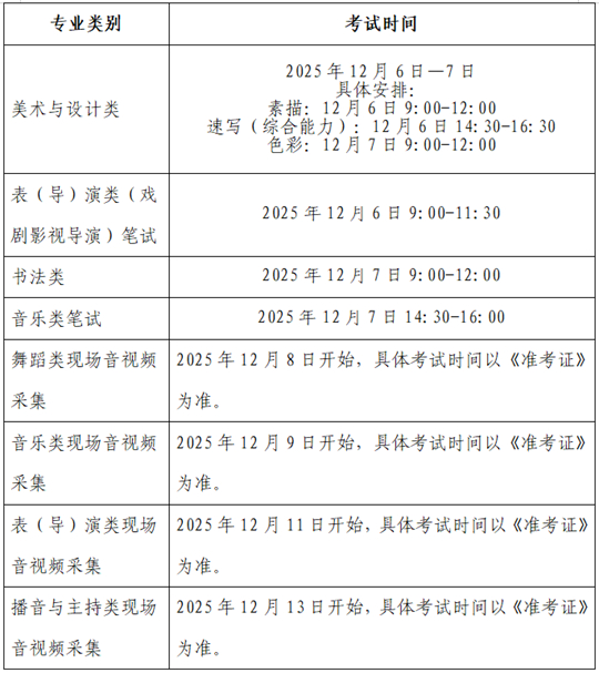 。2)藝術(shù)類專業(yè)省級統(tǒng)考筆試科目安排在2025年12月6日至7日進行,現(xiàn)場音視頻采集科目于2025年12月8日開始。具體安排如下表: