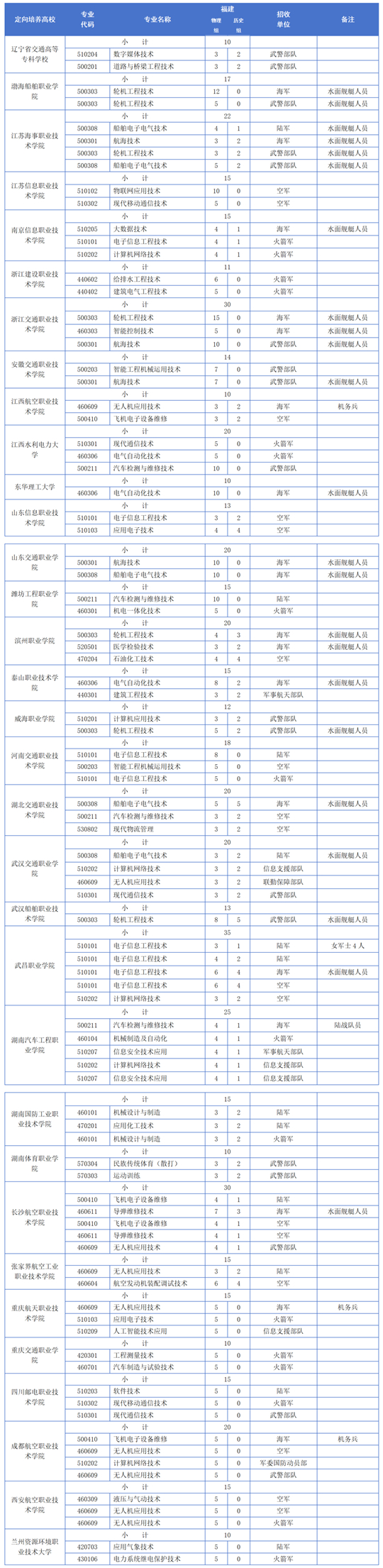 2025年,國家核定的33所地方院校在高職(?疲⿲哟握猩(jì)劃內(nèi),面向我省為解放軍和武警部隊(duì)招收定向培養(yǎng)軍士555人,其中女軍士4人。