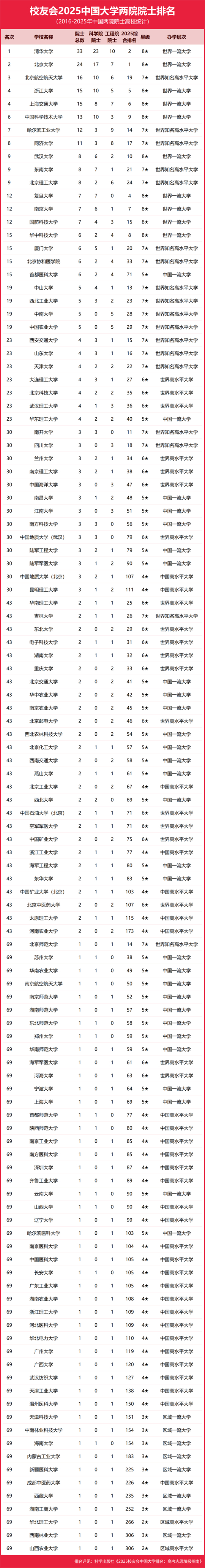 校友會(huì)中國大學(xué)排名基于“大平臺(tái)、大團(tuán)隊(duì)、大項(xiàng)目、大成果、大校友”體系框架對中國高校辦學(xué)質(zhì)量進(jìn)行系統(tǒng)評價(jià),至今已有23年的歷史,已成為具有廣泛社會(huì)影響力、公信力、參考價(jià)值與創(chuàng)新力的中國大學(xué)排名領(lǐng)先品牌。校友會(huì)2025中國大學(xué)兩院院士排名統(tǒng)計(jì)對象為2016-2025年中國高校申報(bào)并當(dāng)選中國科學(xué)院和中國工程院院士的教師。