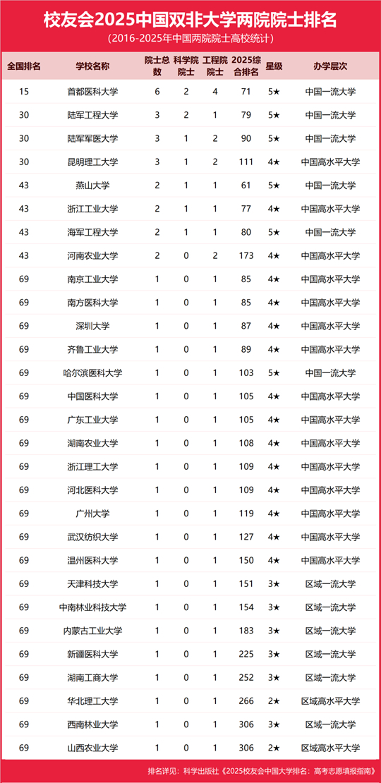 首都醫(yī)科大學(xué)雄居2025中國雙非大學(xué)兩院院士排名冠軍,燕山大學(xué)、河南農(nóng)業(yè)大學(xué)等8校挺進(jìn)全國50強(qiáng)