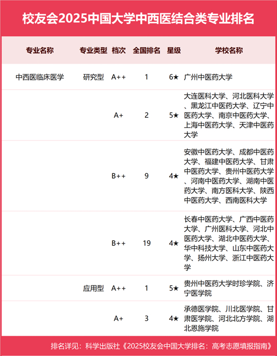 校友會2025中國大學(xué)中西醫(yī)結(jié)合類專業(yè)排名(應(yīng)用型)