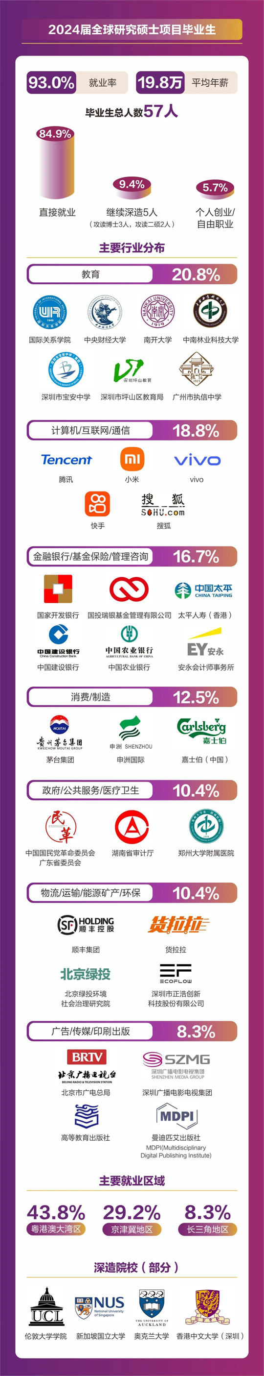人文社科學(xué)院碩士畢業(yè)人數(shù)共計(jì)157人,分別來自翻譯(筆譯/口譯)、同聲傳譯、應(yīng)用心理學(xué)、全球研究、中國語言文學(xué)等5個(gè)碩士項(xiàng)目。2024屆碩士畢業(yè)生總體就業(yè)率達(dá)到92.36%,平均年薪為18. 4萬元。其中86.2%畢業(yè)生選擇直接就業(yè),畢業(yè)生就業(yè)行業(yè)分布廣泛,涵蓋了教育、計(jì)算機(jī)/互聯(lián)網(wǎng)/通信、貿(mào)易/消費(fèi)/制造/營運(yùn)、金融/銀行/證券/基金、政府/社會治理/公共服務(wù)、廣告/傳媒/印刷出版、管理咨詢/專業(yè)服務(wù)、能源礦產(chǎn)/石油化工/環(huán)保、醫(yī)藥生物/醫(yī)療衛(wèi)生、物流/運(yùn)輸?shù)榷鄠(gè)行業(yè)領(lǐng)域。就業(yè)地點(diǎn)主要集中在粵港澳大灣區(qū)、京津冀區(qū)以及長三角地區(qū)等一線城市及生活圈。11%的學(xué)生則選擇繼續(xù)深造,其中12人將在境內(nèi)外知名院校攻讀博士學(xué)位。