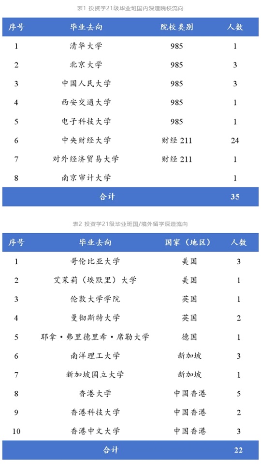 四度春秋磨礪,收獲累累碩果。中央財(cái)經(jīng)大學(xué)投資學(xué)專業(yè)2021級(jí)畢業(yè)班同學(xué)們銳意進(jìn)取、奮力拼搏,學(xué)習(xí)于課堂之上,鍛煉于實(shí)踐之間,積極擁抱數(shù)字創(chuàng)新、交叉融合的時(shí)代浪潮,踴躍踐行經(jīng)世濟(jì)民、財(cái)菁強(qiáng)國(guó)的青年使命,以優(yōu)異的成績(jī)與全面的成長(zhǎng),交出又一份畢業(yè)季亮眼答卷。截止目前,已有35位同學(xué)確定國(guó)內(nèi)升學(xué)深造,22位同學(xué)確定國(guó)/境外留學(xué)深造,畢業(yè)深造率為73.08%。國(guó)內(nèi)深造高校涵蓋了包括清華大學(xué)、北京大學(xué)、中國(guó)人民大學(xué)、西安交通大學(xué)、電子科技大學(xué)、中央財(cái)經(jīng)大學(xué)、對(duì)外經(jīng)濟(jì)貿(mào)易大學(xué)在內(nèi)的國(guó)內(nèi)知名高校(見(jiàn)表1);國(guó)/境外留學(xué)高校涵蓋了包括哥倫比亞大學(xué)、曼徹斯特大學(xué)、新加坡國(guó)立大學(xué)、南洋理工大學(xué)等在內(nèi)的國(guó)際知名高校(見(jiàn)表2)。