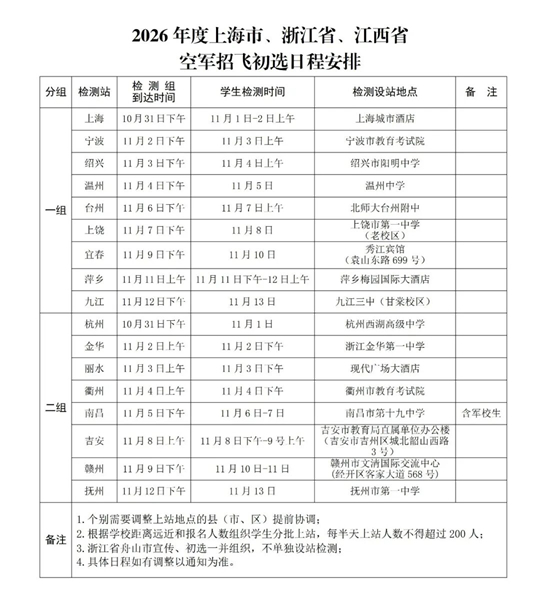 根據(jù)2026年度空軍招飛工作安排,11月1日至11月13日,空軍招飛局南京選拔中心將派初選組在上海市、浙江省、江西省各地市設(shè)站對報(bào)考空軍飛行學(xué)員的軍校生、高中生進(jìn)行檢測。