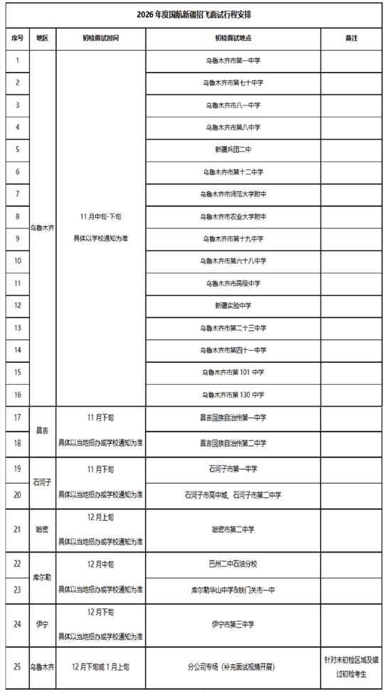 溫馨提示:初檢面試即將于2025年11月中旬陸續(xù)開展,以上安排為計(jì)劃,如有變動(dòng),由國(guó)航新疆分公司招飛辦公室與各地招生辦、學(xué)校協(xié)商后另行通知。為提升初檢面試效率,每天的初檢面試活動(dòng)分為不同場(chǎng)次進(jìn)行,請(qǐng)考生按照學(xué)校或短信通知的時(shí)間提前10分鐘到場(chǎng)。
