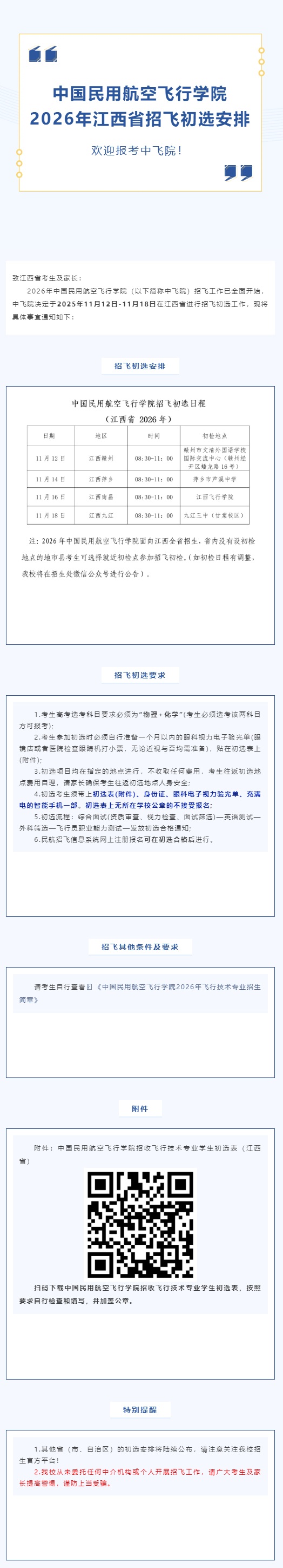 中國民用航空飛行學(xué)院2026年江西省招飛初選安排
