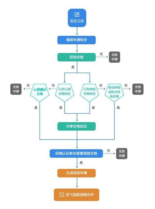 為幫助您在招飛選拔過程中節(jié)約時間和費用,便于您更好地備考,同時讓您有機會在更多的合格申請組合中選擇確認有效招飛申請,系統(tǒng)對部分環(huán)節(jié)的結論在特定情況下設定了結論共享。請注意,這里的結論共享特指申請組合之間共享。