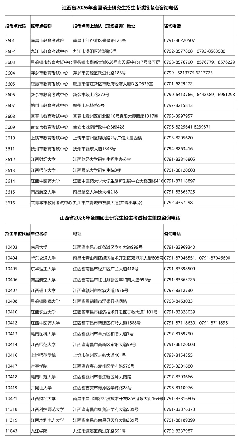 | 江西省2026年全國碩士研究生招生考試報(bào)考點(diǎn)和招生單位咨詢電話 |