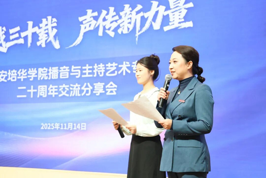 2025年11月14日,“跨越三十載·聲傳新力量”西安培華學院播音與主持藝術專業(yè)二十周年交流分享會在明德樓報告廳舉行;顒友埮c學校結緣30載的中央廣播電視總臺播音指導,原中央電視臺《新聞聯(lián)播》欄目主播、播音部主任李瑞英作為特邀主講嘉賓重返培華,為現(xiàn)場三百余名師生帶來一場高規(guī)格的學術與思想盛宴。