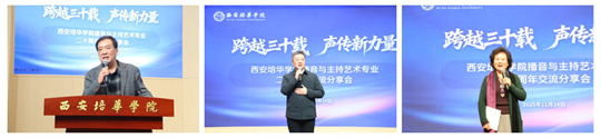 陜西廣播電視臺播音指導、陜西省第九屆\第十屆政協(xié)委員陳愛美,陜西廣播電視臺播音指導、中國播音主持“金話筒”獎獲得者包志堅,西安廣播電視臺原副臺長、二級教授、播音指導嚴一寧,西安培華學院理事長姜波,黨委副書記、副校長姚文靜,傳媒與設計學院、女子學院、黨委宣傳部相關負責人及播音與主持藝術專業(yè)歷屆校友、全體專任教師、學生代表出席活動。傳媒與設計學院教師賈登銀主持活動。