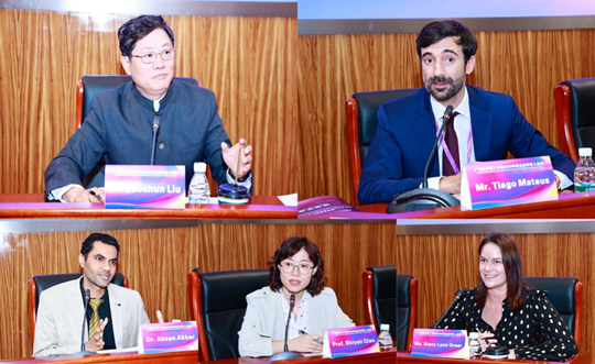 11月13日,秋高氣爽,異木棉花競相綻放,由廣州城市理工學(xué)院主辦,國際商學(xué)院和國際交流與合作處承辦,外國語學(xué)院協(xié)辦的2025年國際校企協(xié)同育人論壇在行政樓703報告廳隆重舉行。本次論壇是廣州城市理工學(xué)院首次主辦全過程使用英語進(jìn)行的國際論壇,展示出學(xué)校日益提升的國際化辦學(xué)水平與搭建高層次國際交流平臺的能力。論壇以“國際商務(wù)新形勢:探索全球勝任力應(yīng)用型人才培養(yǎng)創(chuàng)新模式”為主題,匯聚了來自葡萄牙、美國、巴基斯坦、印度等國家的專家學(xué)者與企業(yè)領(lǐng)袖,共同探討國際商務(wù)教育創(chuàng)新與全球勝任型人才培養(yǎng)的新路徑。葡萄牙駐廣州總領(lǐng)事館(以下簡稱總領(lǐng)事館)貿(mào)易與文化事務(wù)高級官員Mariana Amado da Silva女士、葡萄牙里斯本大學(xué)學(xué)院(以下簡稱里斯本大學(xué)學(xué)院)Ricardo Paes Mamede教授、JOINCO Import & Export Ltd.(以下簡稱JOINCO公司)首席執(zhí)行官Pedro Cunha先生、中國區(qū)負(fù)責(zé)人Tiago Mateus先生、廣州市圣瑞吉貿(mào)易有限公司創(chuàng)始人Shyju Thumbrayil先生、廣州瀚卓藥業(yè)有限公司創(chuàng)始人羅文航等嘉賓與近200名師生參加了論壇。學(xué)校副校長劉洊波教授作歡迎致辭,校長蘇成教授作論壇主旨報告,會議由國際商學(xué)院院長安然教授主持。
