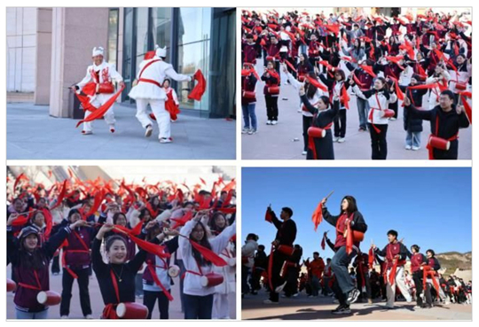 場景互動(dòng)體驗(yàn)課中激情教學(xué)陜北腰鼓,紅色的腰鼓系在腰間,鮮艷的綢帶隨風(fēng)飄揚(yáng)。學(xué)員們認(rèn)真學(xué)習(xí)基本動(dòng)作和技巧,敲打出激昂有力的鼓點(diǎn)。歡快的鼓聲中洋溢出燦爛的笑容,紅色文化在互動(dòng)傳習(xí)中代代相傳。