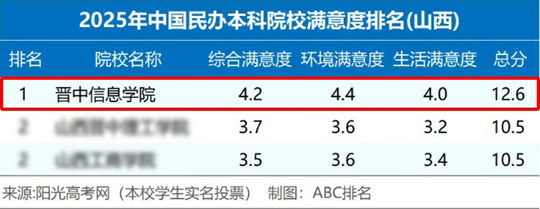 近日,ABC排名發(fā)布2025年各省本科院校滿意度排名,晉中信息學(xué)院憑借高質(zhì)量的硬件設(shè)施、高品質(zhì)的服務(wù)保障、多元化的育人模式以及良好的社會(huì)聲譽(yù)在2025年中國大學(xué)院校滿意度排名(山西)中位列全省第三,同類院校第一。