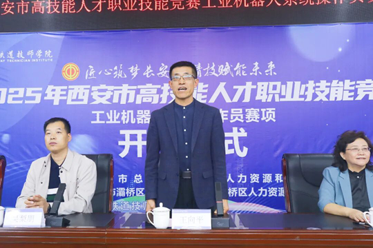 西安鐵道技師學(xué)院黨委書(shū)記、校長(zhǎng)左永煥致開(kāi)幕詞,代表學(xué)校對(duì)各位領(lǐng)導(dǎo)的支持和信任表示衷心感謝,向大賽組委會(huì)成員、各參賽隊(duì)伍及裁判專家們致以熱烈歡迎。他表示,工業(yè)機(jī)器人作為“新質(zhì)生產(chǎn)力”的核心載體,其技術(shù)應(yīng)用與人才儲(chǔ)備已成為衡量區(qū)域競(jìng)爭(zhēng)力的關(guān)鍵指標(biāo)。本次競(jìng)賽以“匠心筑夢(mèng)長(zhǎng)安,精技賦能未來(lái)”為主題,聚焦工業(yè)機(jī)器人系統(tǒng)操作員賽項(xiàng),精準(zhǔn)對(duì)接《中國(guó)制造2025》戰(zhàn)略需求,既是落實(shí)“深化產(chǎn)教融合、強(qiáng)化技能報(bào)國(guó)”的實(shí)踐行動(dòng),也是對(duì)學(xué)校辦學(xué)辦賽實(shí)力的肯定與檢閱,同時(shí)表示將全力保障賽事,期盼深化合作共譜技能成才新篇章。