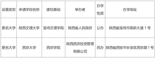根據《中華人民共和國高等教育法》《普通高等學校設置暫行條例》《普通本科學校設置暫行規(guī)定》等有關規(guī)定,經陜西省高等學校設置評議委員會考察和評議,現對擬向教育部申報的“寶雞文理學院更名陜西文理大學”“西京學院更名西京大學”事項予以公示,接受社會監(jiān)督。