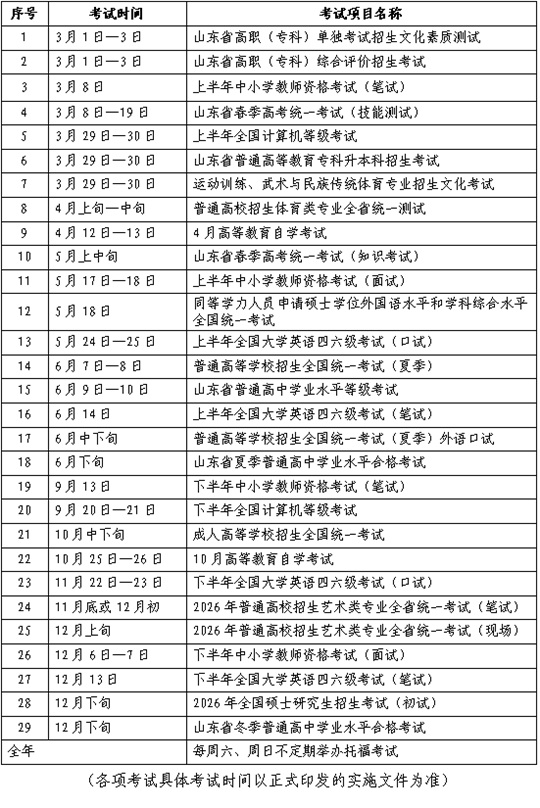 2025年山東省教育考試時間安排表