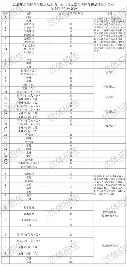 2025年沈陽體育學院體育單招專業(yè)分項目招生計劃表