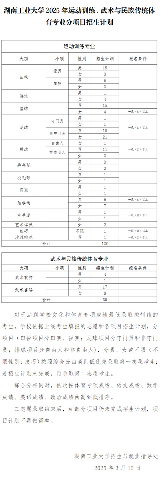 | 湖南工業(yè)大學2025年運動訓練、武術(shù)與民族傳統(tǒng)體育專業(yè)分項目招生計劃 |