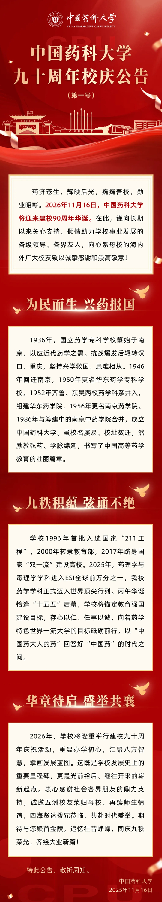 中國(guó)藥科大學(xué)九十周年校慶公告(第一號(hào))