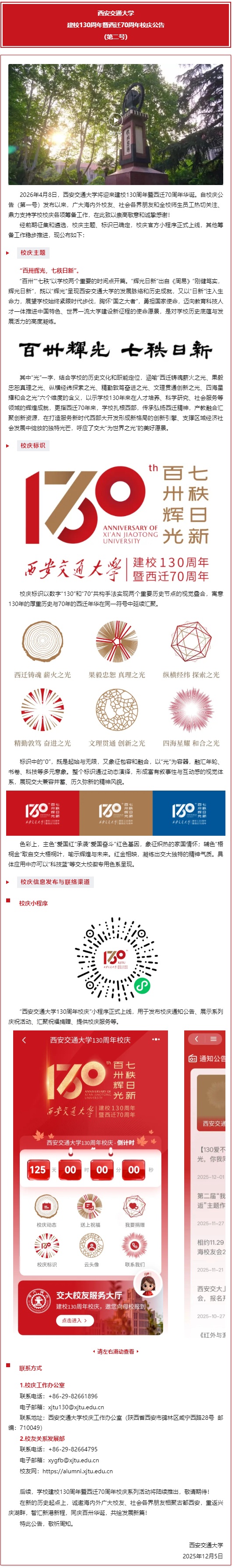 西安交通大學(xué)建校130周年暨西遷70周年校慶公告(第二號)