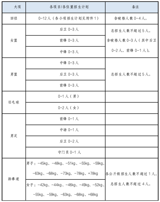 田徑、羽毛球、足球項(xiàng)目按照全國統(tǒng)考成績,分小項(xiàng)/性別/位置確定各招生項(xiàng)目合格名單。