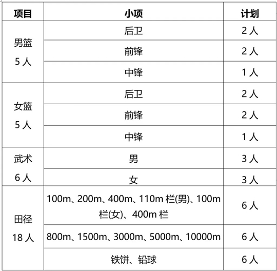田徑、籃球、武術(shù)(套路),共計(jì)招收34人。其中,田徑限以下小項(xiàng):100m、200m、400m、110m欄(男)、100m欄(女)、400m欄、800m、1500m、3000m、5000m、10000m、鐵餅、鉛球。