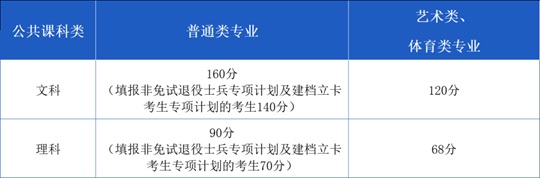填報(bào)非免試退役士兵專項(xiàng)計(jì)劃和建檔立卡考生專項(xiàng)計(jì)劃中藝術(shù)類、體育類專業(yè)的考生,其公共課合格線按照低線執(zhí)行(即文科120分,理科68分)。