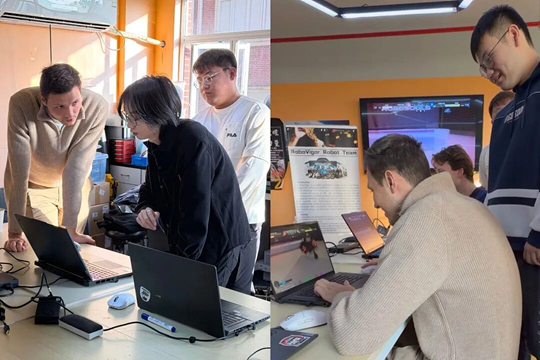 介紹完畢,陳淇引導(dǎo)同學(xué)們來到活動(dòng)室中央,一場別開生面的機(jī)器人互動(dòng)體驗(yàn)隨即展開。國際生們興致勃勃地拿起遙控器,親身體驗(yàn)操控RoboVigor自主研發(fā)的機(jī)器人。隊(duì)長周瓊為同學(xué)們簡明精要地介紹了機(jī)器人的設(shè)計(jì)與原理,其精妙的結(jié)構(gòu)與靈活的表現(xiàn)令大家贊嘆連連。緊接著,電控組組員劉睿哲介紹了賽隊(duì)參與的各項(xiàng)賽事及比賽規(guī)則,并圍繞實(shí)戰(zhàn)經(jīng)驗(yàn)與備賽策略,與國際生們展開了熱烈交流。而在另一邊,機(jī)械組組長畢宗洋邀請同學(xué)們坐到電腦前,體驗(yàn)機(jī)器人競賽全真模擬軟件,國際生們化身機(jī)器人操縱師,在模擬場地中大顯身手。
