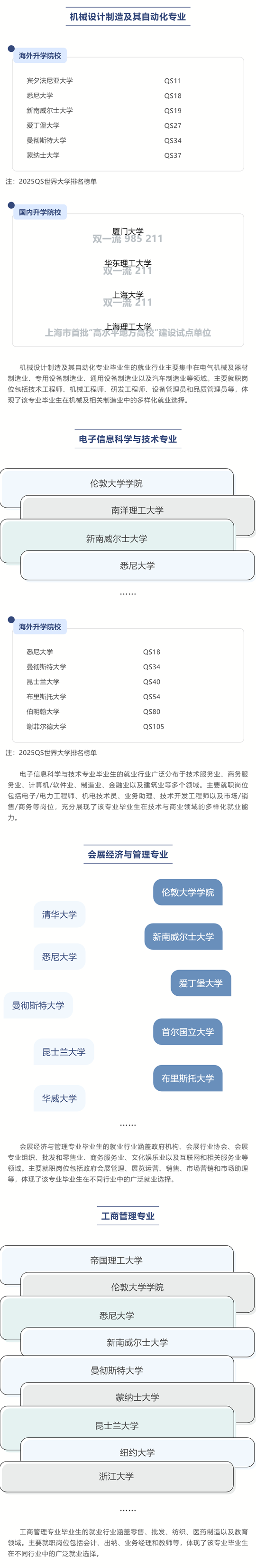 各專業(yè)升學(xué)亮點(diǎn)頻現(xiàn),充分展現(xiàn)了學(xué)院在多學(xué)科領(lǐng)域的深厚底蘊(yùn)與育人成果,涵蓋從理工科前沿科技到商科等多個(gè)領(lǐng)域。例如:機(jī)械設(shè)計(jì)制造及其自動(dòng)化專業(yè)中,選擇境外升學(xué)的畢業(yè)生100%進(jìn)入世界排名前100的院校;電子信息科學(xué)與技術(shù)專業(yè)中,80%選擇境外升學(xué)的畢業(yè)生進(jìn)入英國(guó)高校;會(huì)展經(jīng)濟(jì)與管理專業(yè)中,超過(guò)50%的畢業(yè)生成功進(jìn)入世界排名前100的院校;工商管理專業(yè)同樣表現(xiàn)亮眼,65.25%的畢業(yè)生選擇繼續(xù)深造,且全部升入了世界排名前100的院校。