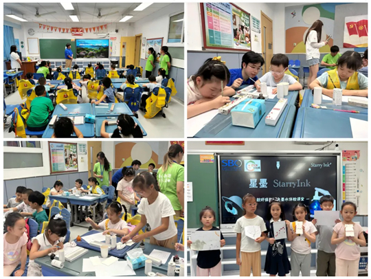 7月7日、17日、29日及8月14日,中英國際學(xué)院的老師、創(chuàng)新領(lǐng)導(dǎo)力中心的學(xué)生們及星墨科創(chuàng)團隊成員組成科創(chuàng)講師團,在雁蕩路七色花小學(xué)開展了主題為“星墨:環(huán)保彩色墨水課堂”的研學(xué)活動,為瑞金二路街道暑托班二至五年級的孩子們,帶來了一場融合美育與科創(chuàng)的奇妙體驗。課堂從“墨水的前世今生”娓娓道來,通過課件展示、視頻講解、互動提問等豐富形式,幫助孩子們學(xué)習(xí)色彩的原理,了解墨水的起源。實踐環(huán)節(jié),天然植物制成的安全環(huán)保彩色墨水變身為教具,孩子們化身“小小畫家”,嘗試使用玻璃筆和彩色墨水創(chuàng)作畫作,在動手實踐中感受科技與藝術(shù)的交融!霸瓉砟梢赃@么環(huán)保又漂亮!”一位三年級學(xué)生在完成作品后興奮地說道。孩子們在一片歡聲笑語中增長本領(lǐng)見識,啟蒙科創(chuàng)思維。